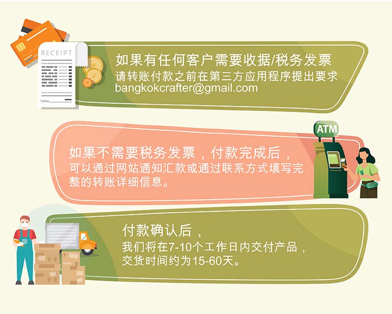 如产品已售罄,BANGKOK CRAFTER 大约需要15到30生产时间。 因此, BANGKOK CRAFTER 保留在任何情况不提前通知的权利。(包括取消生产)。